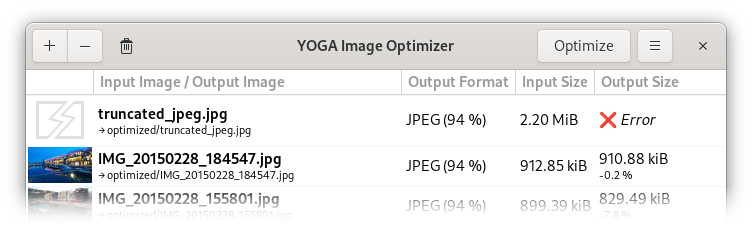 And if an error occurs during the image optimization (because of a broken image, a permission issue for the output file, a lack of memory,...), this does not crash the whole process anymore. The error is simply reported in the "Output Size" column.