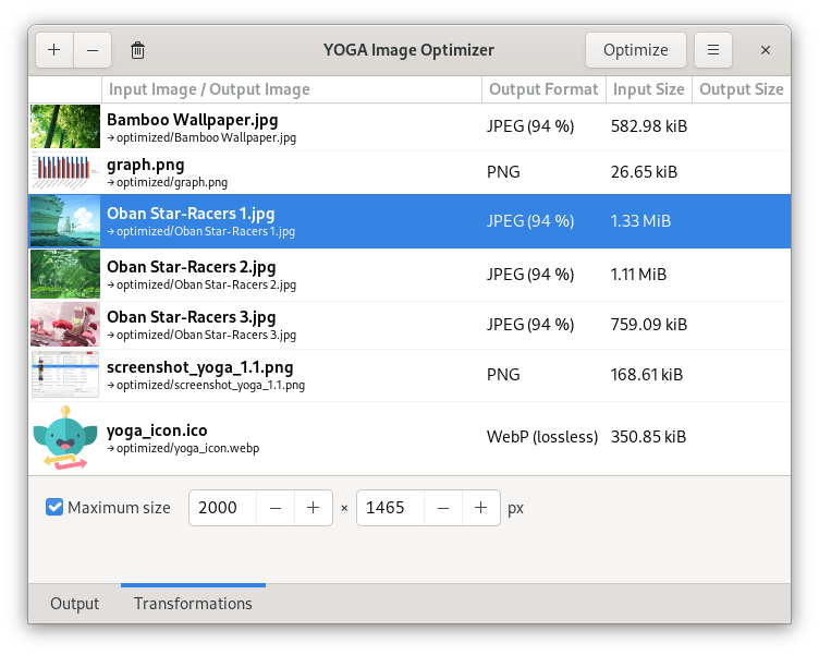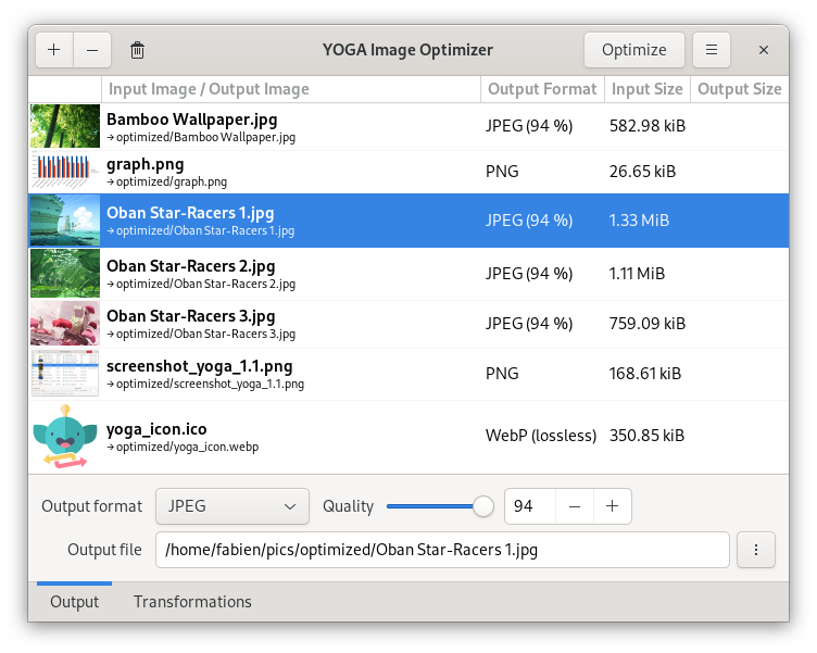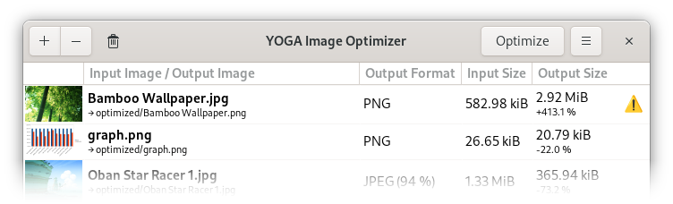 The thumbnail generation has also been sped up for Linux users. When you browse your folders with your favorite file browser (Nautilus, Dolphin, Thunar,...) or when you open an image in some software like GIMP, a thumbnail is generated and placed in a shared cache (generally located in ~/.cache/thumbnails/). YOGA Image Optimizer is now aware of this mechanism and will use the already generated thumbnails from it every time it is possible. This avoids a lot of useless computation and makes the preview loading almost instantaneous!