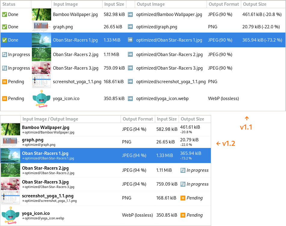 The image list part has more changes. The first one is that some columns have been merged. So the "Input Image" and the "Output Image" columns are now one, and the same goes for the "Status" and "Output Size" column as the status is no more needed once the optimization done. To merge multiple informations in one column, we now use multi-line texts along with font styles (font size and font weight) to keep this readable.