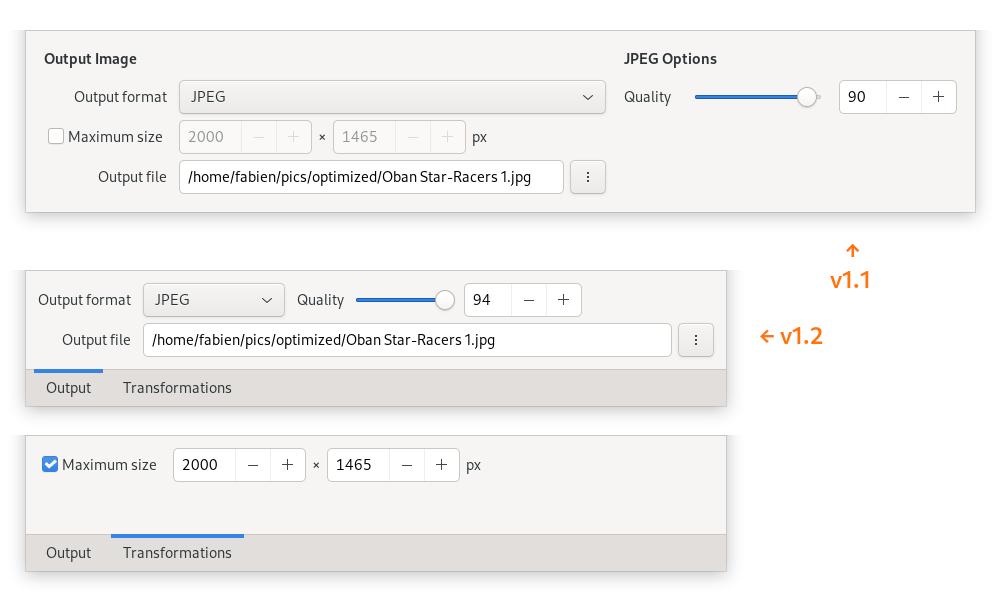 Finally, the output options section at the bottom of the window has been reorganized. The "basic" output options (image format and output file) has been separated from the "transformation" options. This makes the interface less bloated and will allow adding more transformation options in the future without having a too loaded interface.